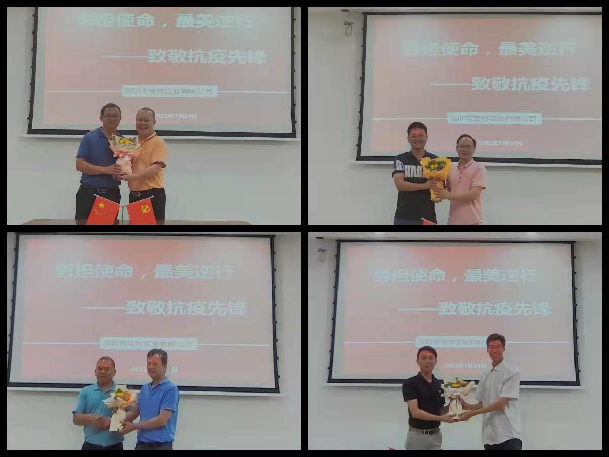 寶牧公司領導班子(zǐ)成員(yuán)為(wèi)下(xià)沉黨員(yuán)幹部獻花(huā),感謝(xiè)他(tā)們在這(zhè)場(chǎng)沒有(yǒu)硝煙($yān)的(de)戰鬥面前,迎難而上(shàng),勇敢逆行(xíng),為(wèi)寶安區(qū)築起牢固的(de)抗疫平安防線。